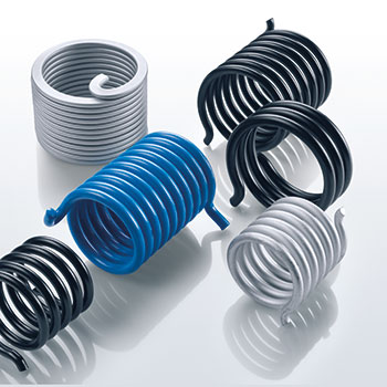 Eine Gruppe gewickelter Federn in verschiedenen Farben – Weiß, Schwarz, Blau und Grau – ist auf einer reflektierenden Oberfläche angeordnet. Jede Feder hat eng gewickelte Schlaufen und kurze, gebogene Enden.